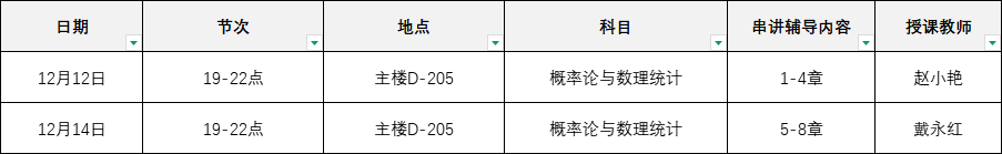 为帮助同学们解决在课程学习中遇到的问题,数学学院开设概率论与数理统计串讲班,详细安排见下表: